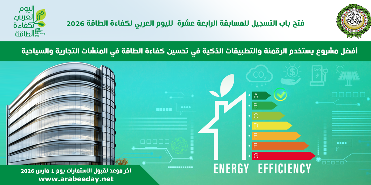 في إطار الاحتفال باليوم العربي لكفاءة الطاقة لعام 2026 والذي تنظمه جامعة الدول العربية (إدارة الطاقة) بالتعاون مع المركز الإقليمي للطاقة المتجددة وكفاءة الطاقة، سيتم تنظيم مسابقة حول ” أفضل مشروع يستخدم الرقمنة والتطبيقات الذكية في تحسين كفاءة الطاقة في المنشآت التجارية والسياحية ” آخر موعد لاستلام الاستمارات من جانب الجهات المتقدمة هو ( 1 مارس 2026 ).